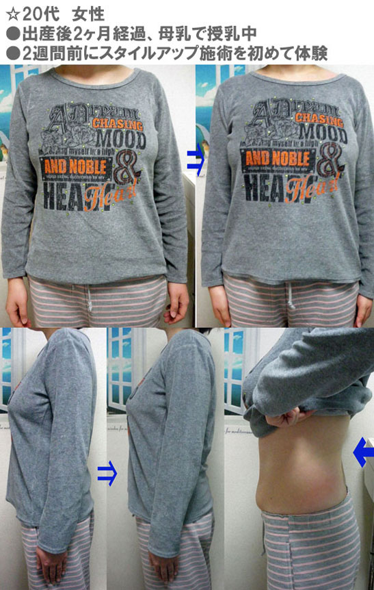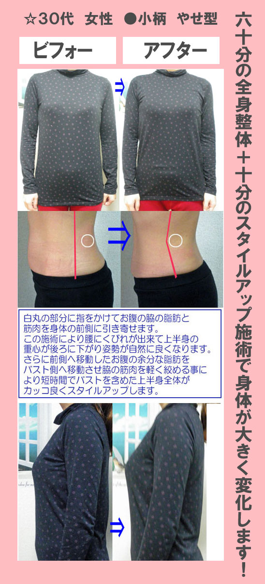 通常の整体に加えて特定の筋肉の締めと緩み、 さらに余分な箇所の脂肪の移動によって女性のスタイルを短時間で キレイにカッ コ良く変化させる当院の新しい手技です。 詳細は下のビフォー、アフター画像をご覧ください 継続して施す事により無理なく、お腹周りの脂肪を移動させるために胴体にくびれが形成されていきます。 是非、全身整体と合 わせて計80分、計110分のスタイルアップ施術をご体験ください。